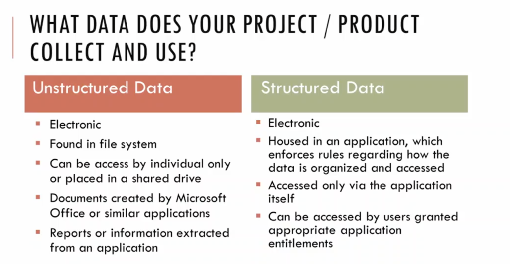 Speaker Kristine shared that there are two types of data, Structured and Unstructured. Structured data is predefined and formatted to a set structure before being placed in data storage, which is housed in applications and accessed only through the application. Users can access the Structured data granted appropriate application entitlements. The best example of Structured Data is the relational database: the data has been formatted into precisely defined fields, such as credit card numbers or addresses. Unstructured Data is everything else that is more difficult to categorize or search, like photos, videos, podcasts, social media posts, and emails. Most of the data in the world is Unstructured Data. Unstructured data can be accessed by individuals only or placed into a shared drive.